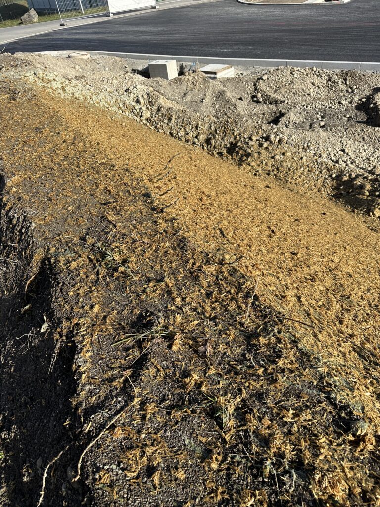 Hydromulching is the technically differentiated form of hydraulic seeding. The seed is embedded in an engineered matrix — water-retaining fibres, tackifiers, nutrients, and mineral soil amendments — that actively supports germination and early development rather than serving as a passive carrier. SRBT has developed proprietary hydromulch formulations with Biopolymer Solutions GmbH that achieve establishment performance that standard mulch products do not reach.